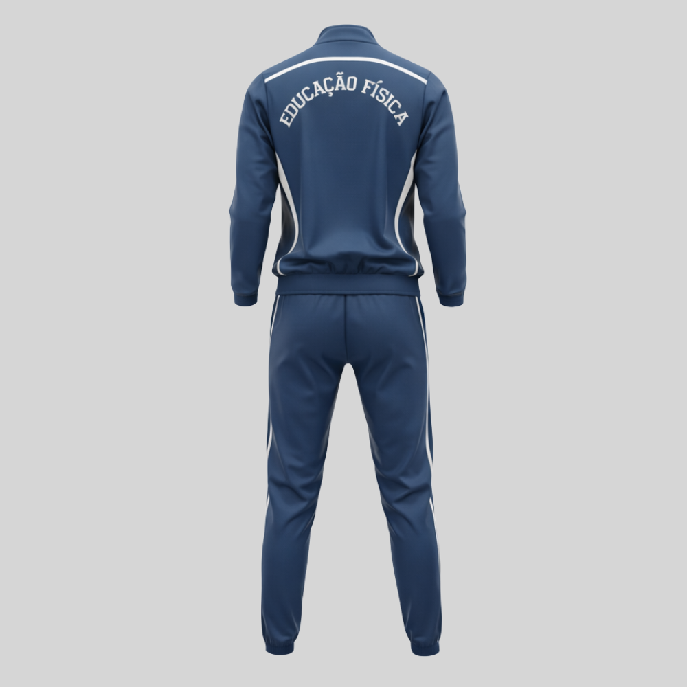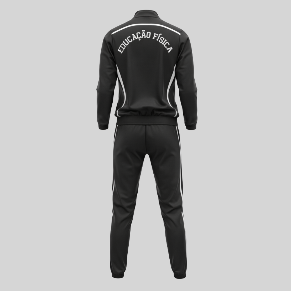 O conjunto é composto por jaqueta com zíper frontal e calça, formando um visual esportivo moderno e funcional. A jaqueta conta com gola alta, punhos ajustados e recortes com faixas contrastantes. Na parte frontal, apresenta a logomarca da Uninter aplicada no canto superior esquerdo, enquanto na parte traseira recebe a aplicação do nome do curso de Educação Física, reforçando a identidade acadêmica.