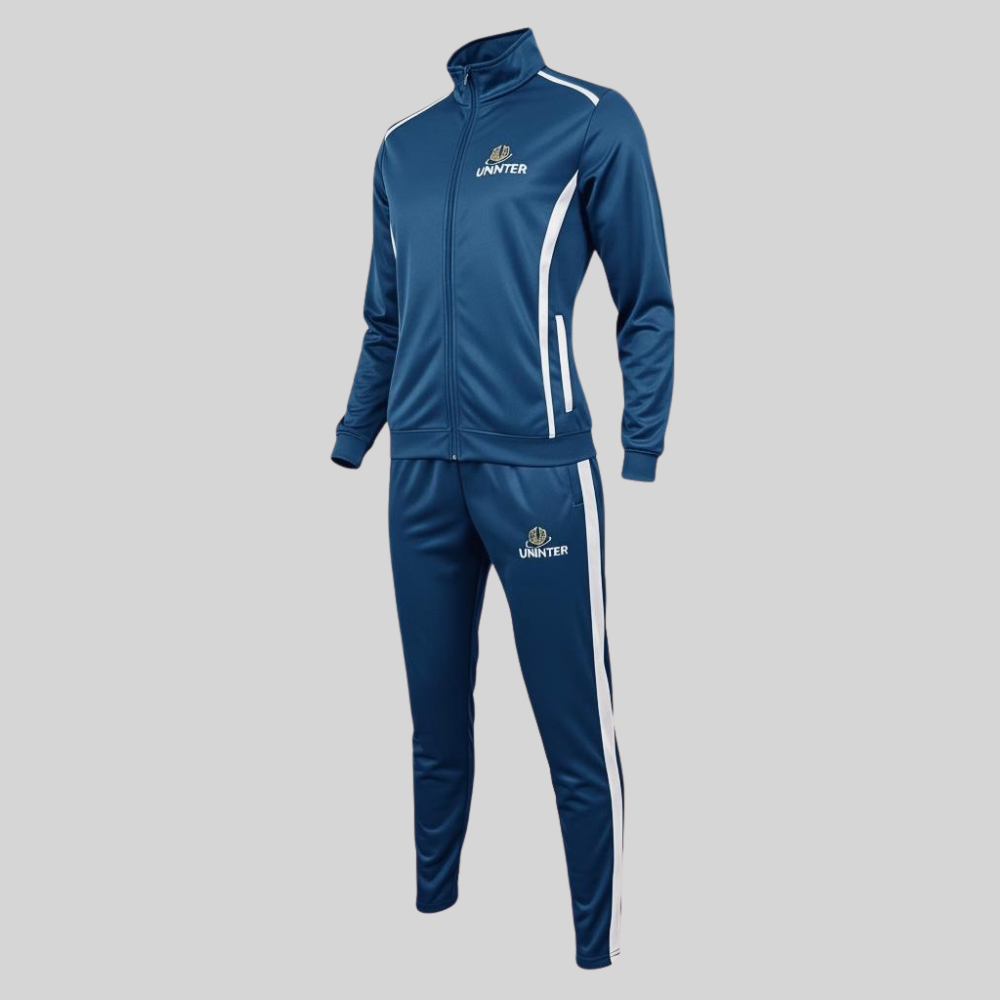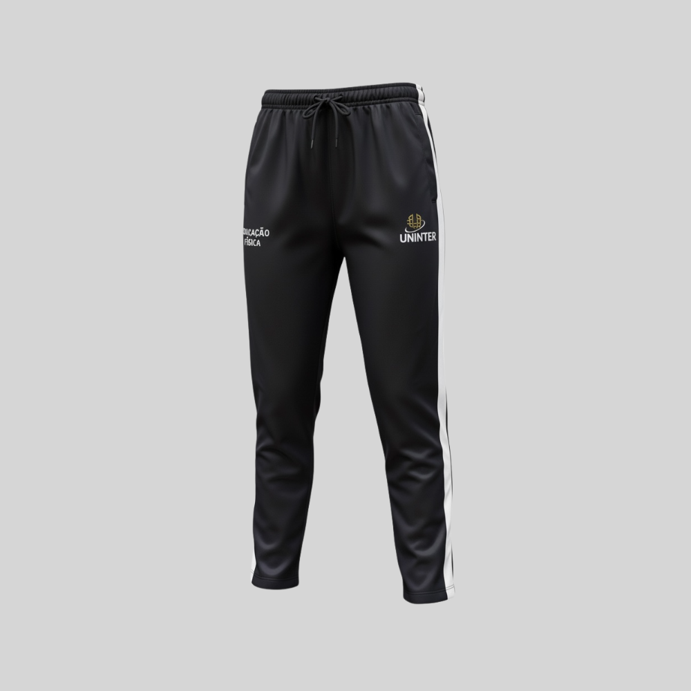 A calça possui modelagem reta com ajuste confortável, cós com elástico, punhos na barra e faixas laterais contrastantes, garantindo melhor caimento e mobilidade. Na parte frontal da calça, a peça também recebe a logomarca da Uninter, harmonizando o design com a jaqueta e fortalecendo a identidade institucional do conjunto.