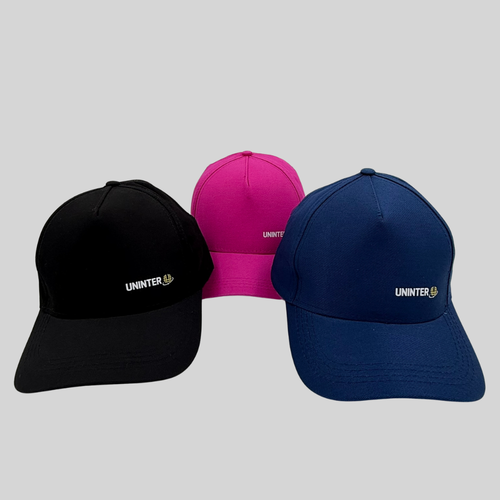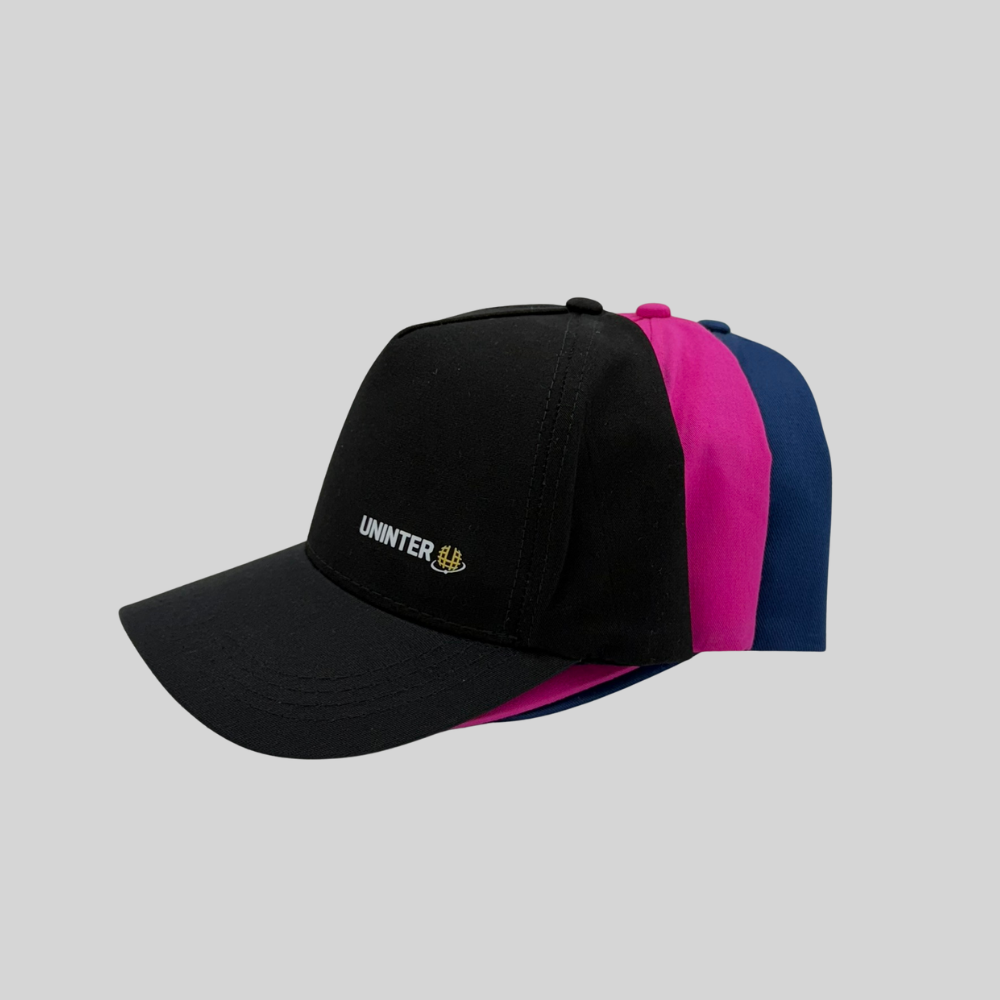 O Boné Clássico Uninter possui modelagem única e confortável, com ajuste na parte traseira que permite melhor adaptação a diferentes tamanhos.