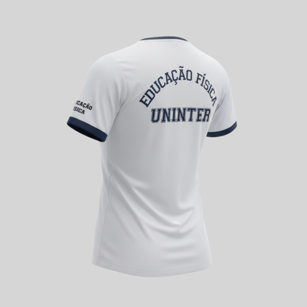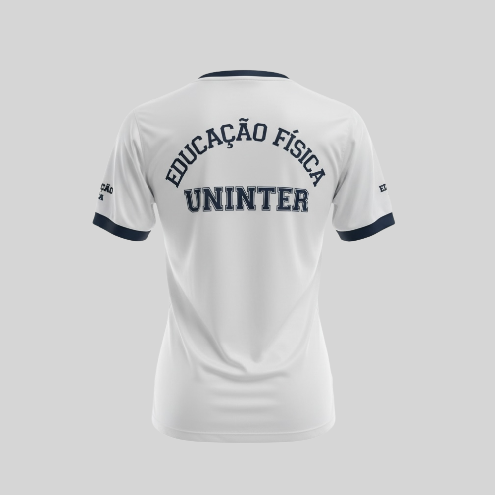 Na parte frontal, a peça conta com a logomarca da Uninter aplicada no canto superior esquerdo. Na parte traseira, a camiseta apresenta a logomarca da Uninter acompanhada do nome do curso de Educação Física. As mangas também recebem a aplicação do nome do curso de Educação Física, complementando o visual da peça.