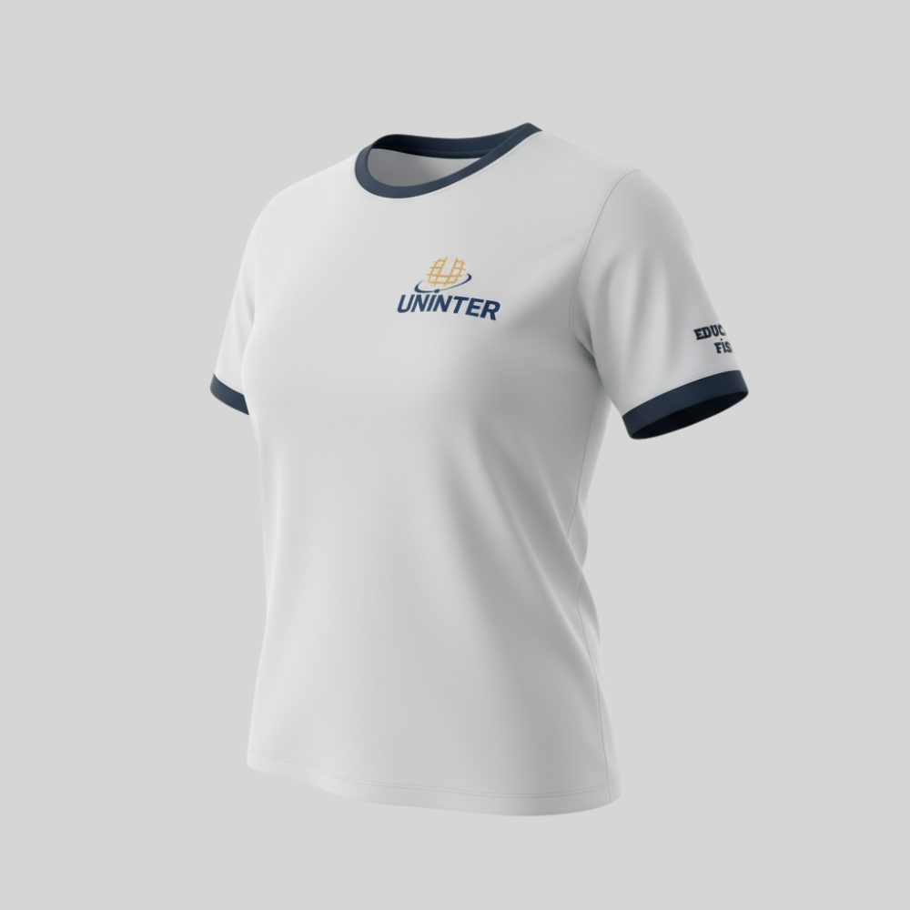 A Camiseta Uninter Feminina de Educação Física apresenta modelagem clássica e confortável, sendo confeccionada em malha 100% poliéster Dry Fit, na cor branca, com tamanhos disponíveis do P ao XG.