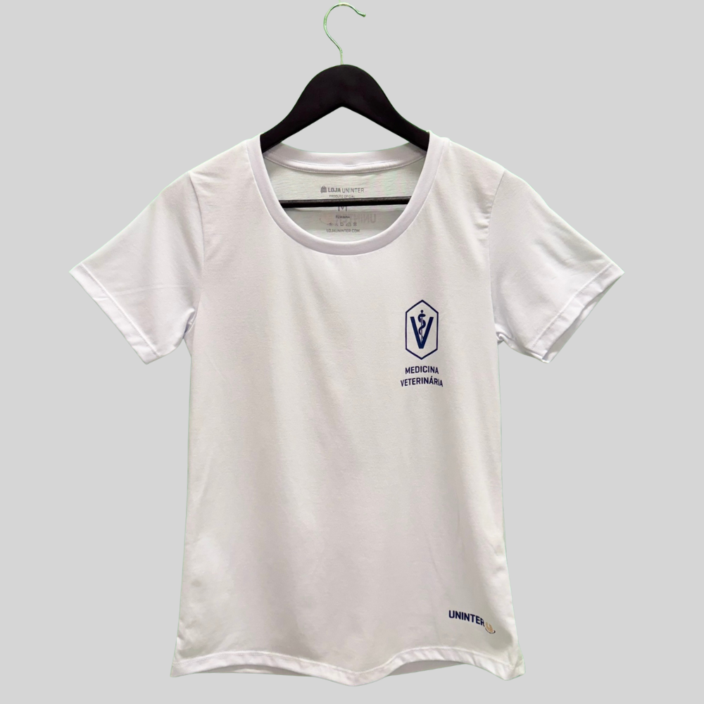 A Camiseta Uninter Feminina de Medicina Veterinária possui modelagem clássica e confortável. É confeccionada em malha 100% algodão, na cor branca, com opções de tamanho que variam de P a GG.