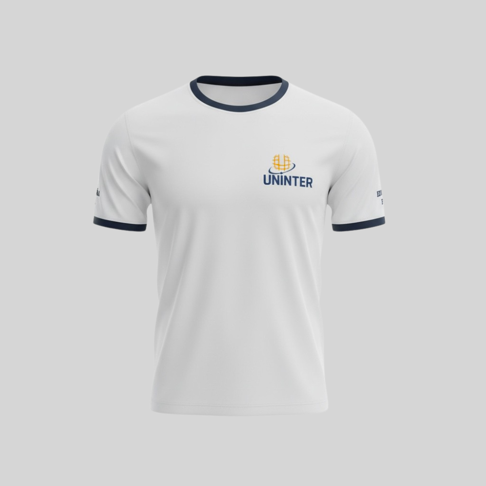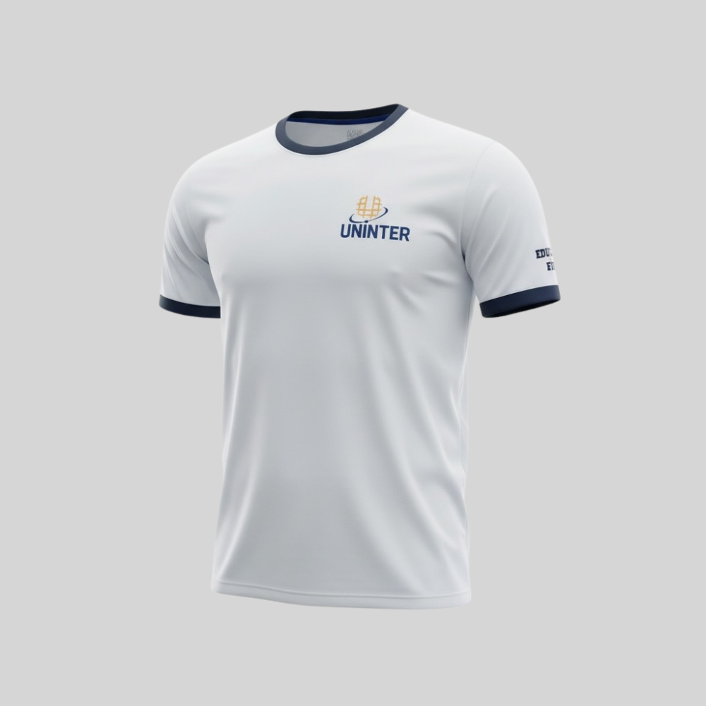 A Camiseta Uninter Masculina de Educação Física apresenta modelagem clássica e confortável, sendo confeccionada em malha 100% poliéster Dry Fit, na cor branca, com tamanhos disponíveis do P ao XG.
