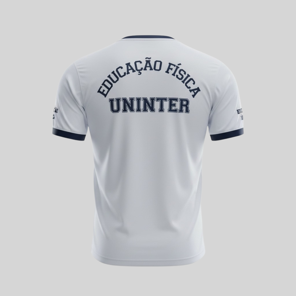 Na parte frontal, a peça conta com a logomarca da Uninter aplicada no canto superior esquerdo. Na parte traseira, a camiseta apresenta a logomarca da Uninter acompanhada do nome do curso de Educação Física. As mangas também recebem a aplicação do nome do curso de Educação Física, complementando o visual da peça.