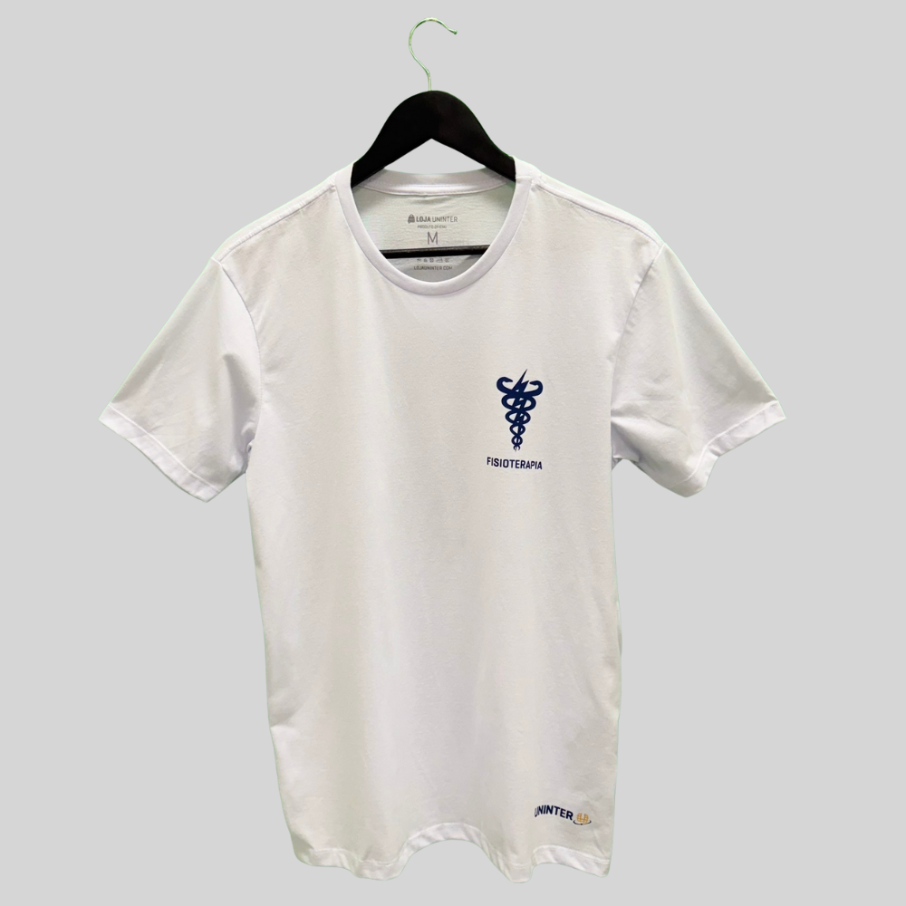 A Camiseta Uninter Masculina de Fisioterapia possui modelagem clássica e confortável. É confeccionada em malha 100% algodão, na cor branca, com opções de tamanho que variam de P a XG.