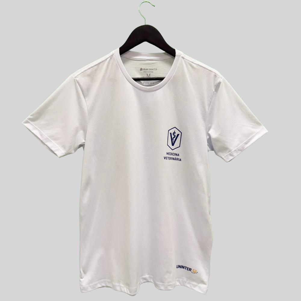 A Camiseta Uninter Masculina de Medicina Veterinária possui modelagem clássica e confortável. É confeccionada em malha 100% algodão, na cor branca, com opções de tamanho que variam de P a XG.
