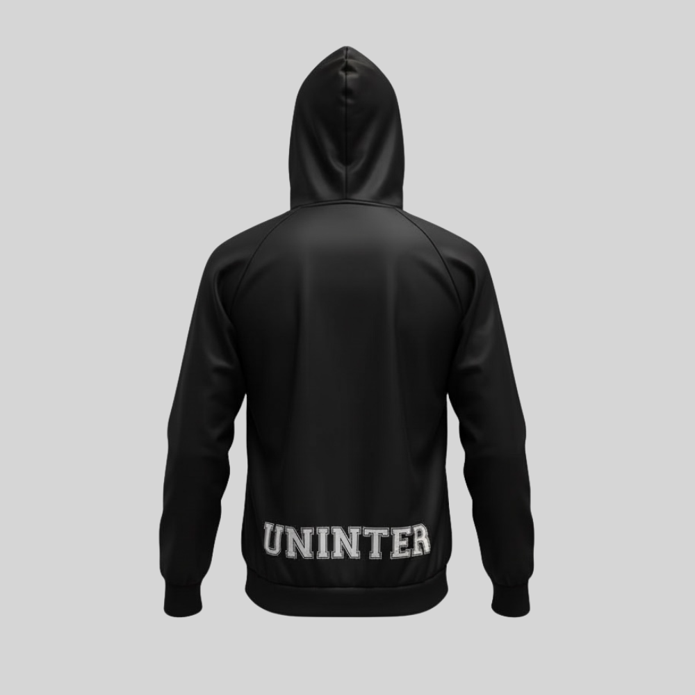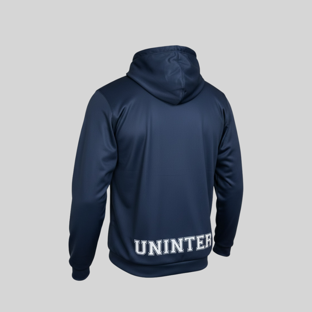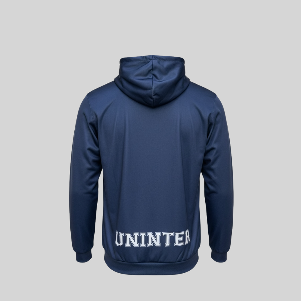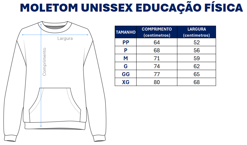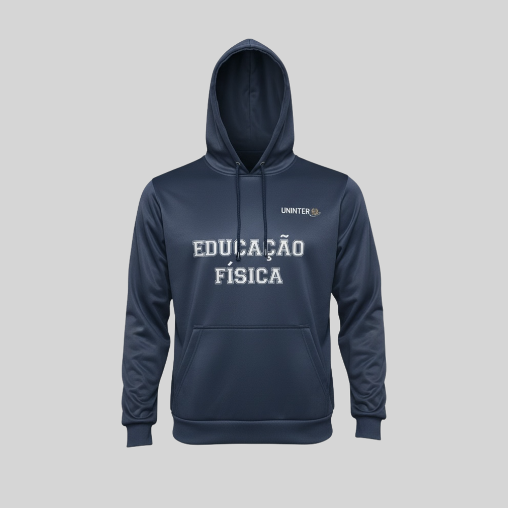 O Moletom Uninter Unissex de Educação Física apresenta modelagem clássica e confortável, sendo confeccionado em tecido 100% poliéster, proporcionando leveza, durabilidade e conforto térmico. A peça está disponível na cor preta e azul-marinho, com tamanhos do P ao XG.