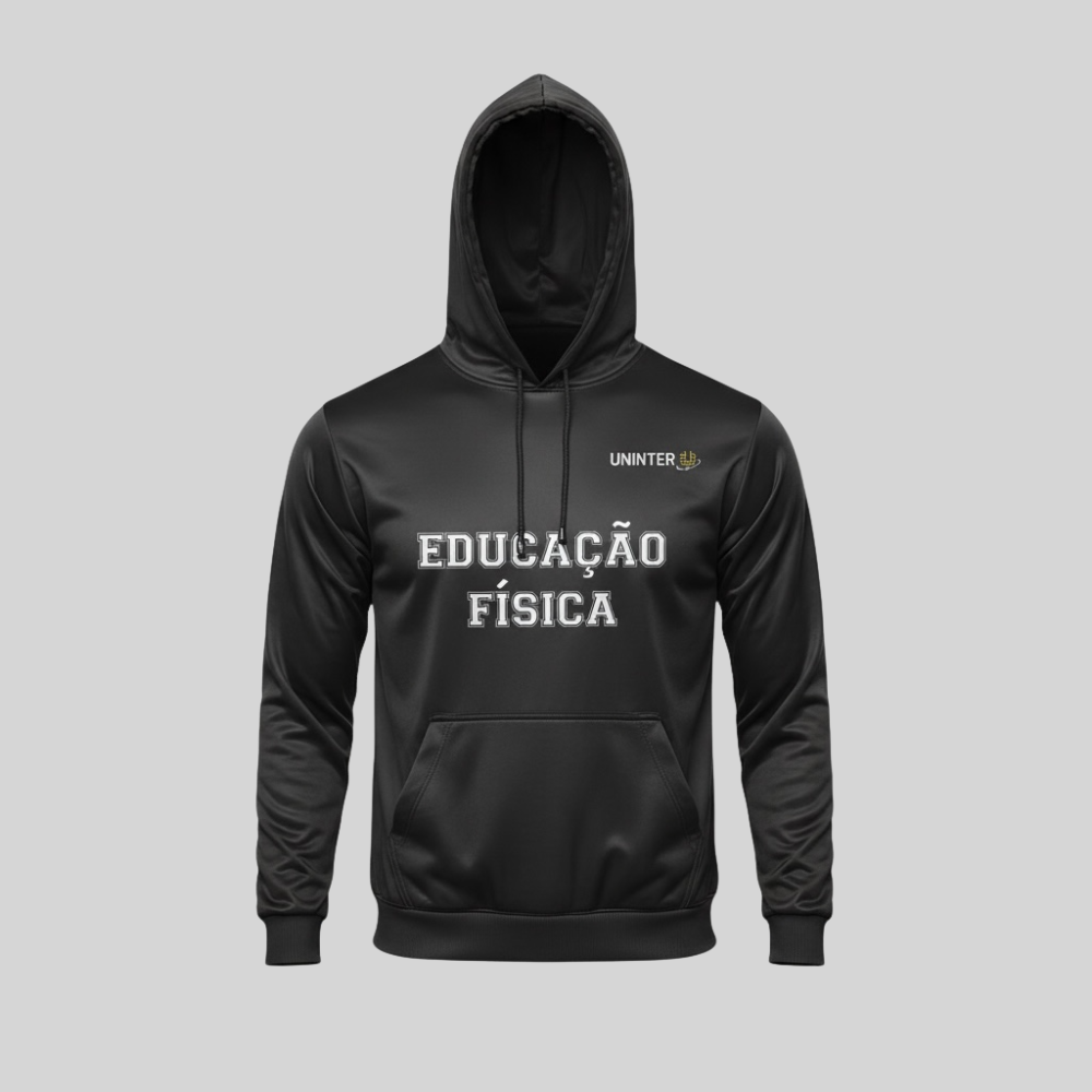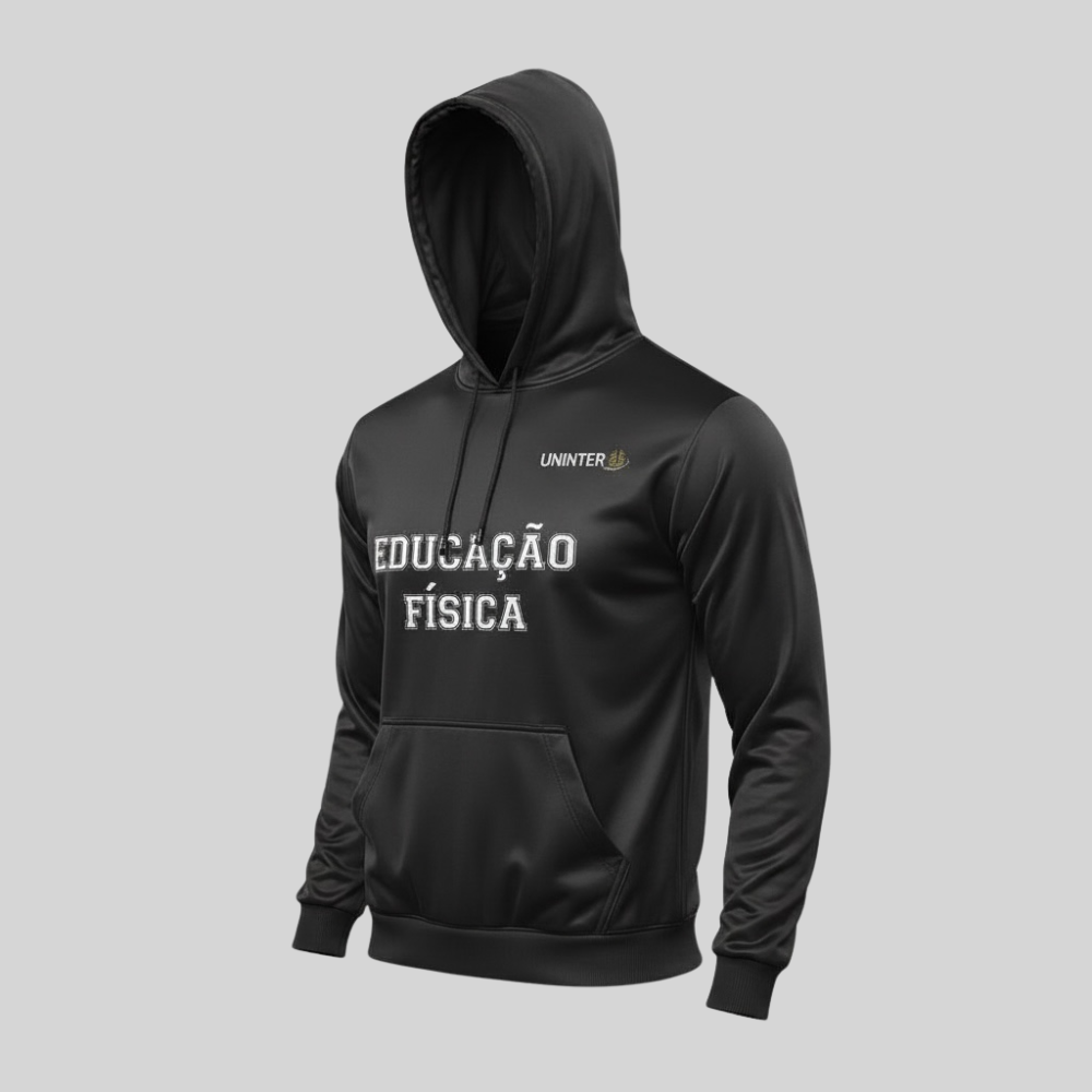 Na parte frontal, o moletom conta com a logomarca da Uninter aplicada no canto superior esquerdo, além do nome do curso Educação Física em destaque no centro da peça, conferindo identidade institucional e visual esportivo. O modelo possui capuz com cordão ajustável e bolso frontal tipo canguru, garantindo praticidade e conforto para o uso diário e atividades acadêmicas.