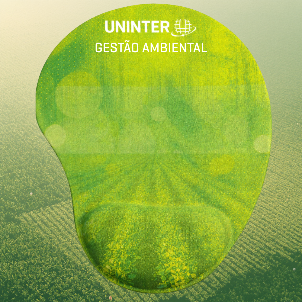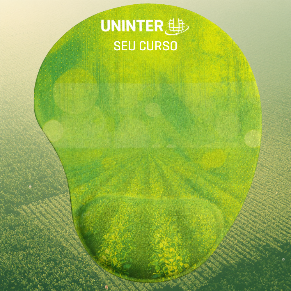 Na parte superior, o mouse pad incorpora a identidade visual da Uninter aliada a elementos gráficos inspirados na Escola Agrária, com símbolos e referências visuais relacionados ao universo do campo, da produção agrícola, da sustentabilidade e do meio ambiente, representando os cursos da área.