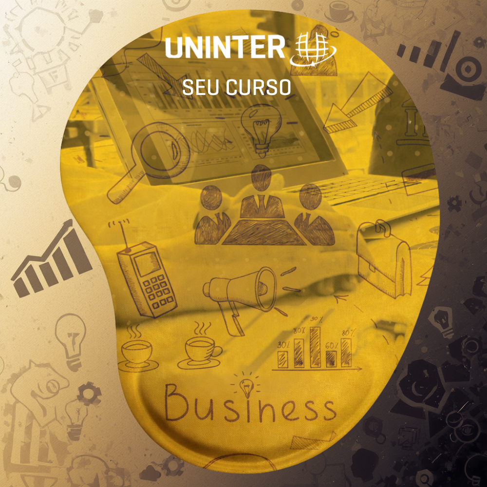 Na parte superior, o mouse pad incorpora a identidade visual da Uninter aliada a elementos gráficos inspirados na Escola de Gestão e Negócios, com símbolos e referências visuais aos cursos da área, como administração, gestão, finanças e áreas correlatas, reforçando o vínculo com o ambiente corporativo e acadêmico. O modelo conta com apoio de punho integrado, que auxilia na redução do esforço e no aumento do conforto durante longos períodos de uso.