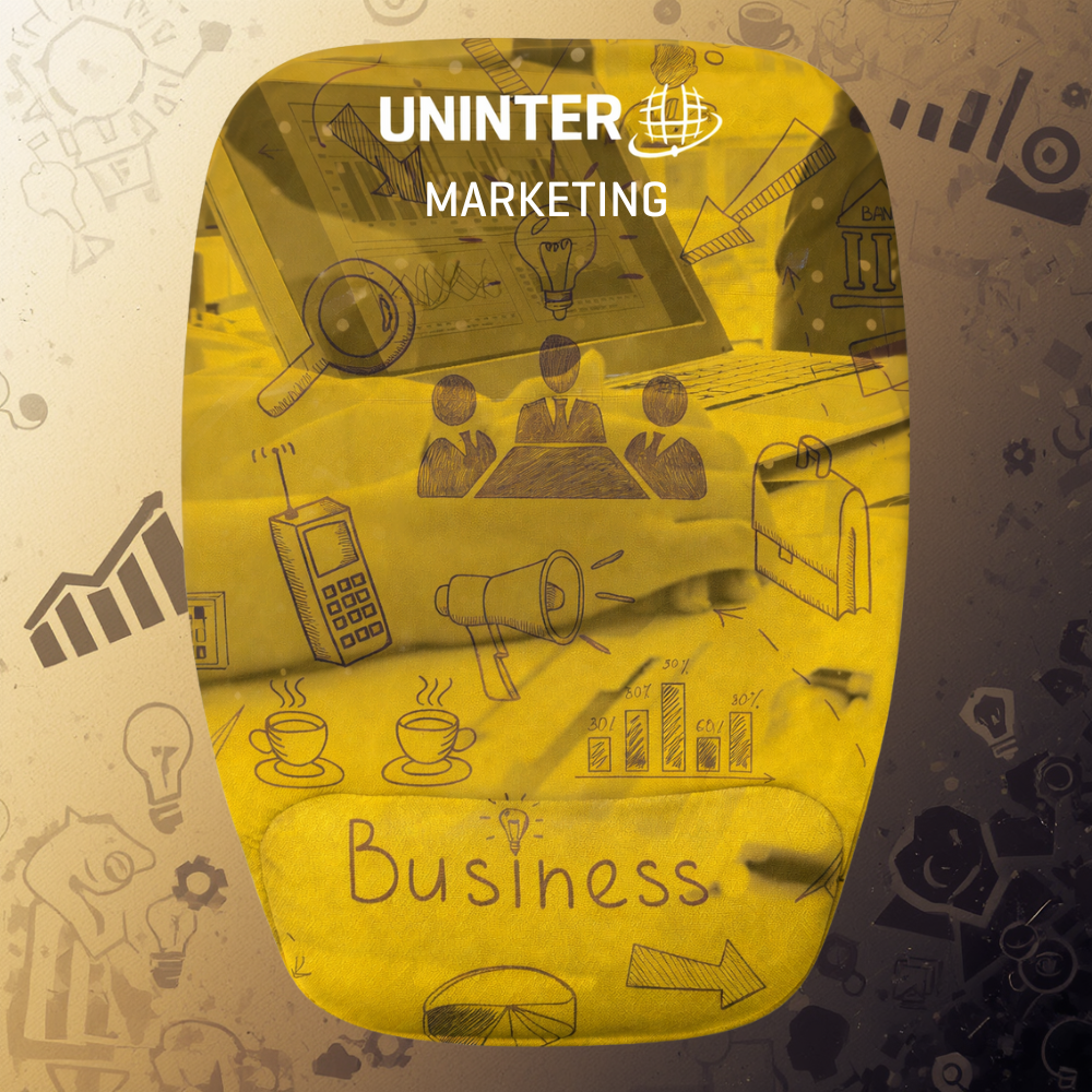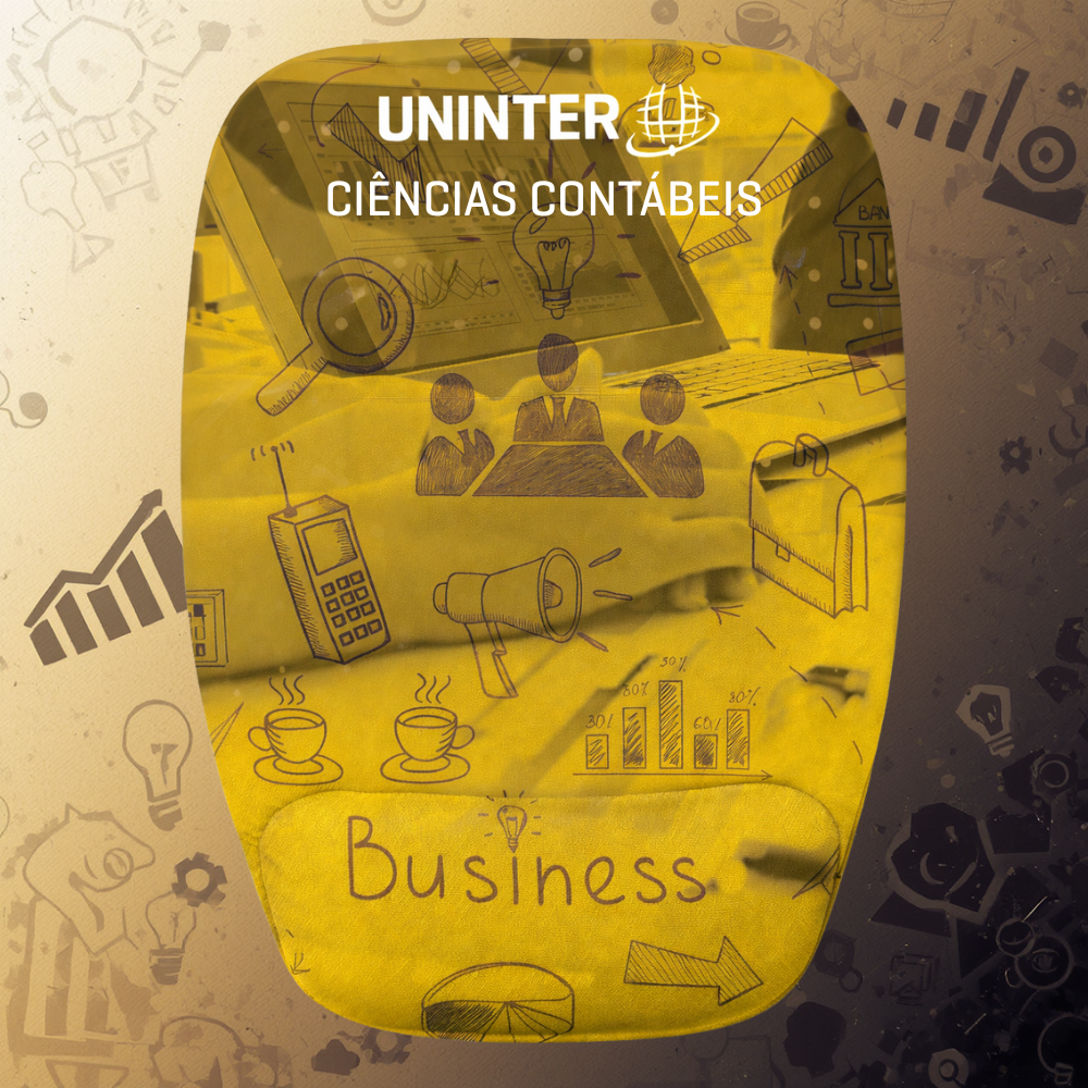 Na parte superior, o mouse pad incorpora a identidade visual da Uninter aliada a elementos gráficos inspirados na Escola de Gestão e Negócios, com símbolos e referências visuais aos cursos da área, como administração, gestão, finanças e áreas correlatas, reforçando o vínculo com o ambiente corporativo e acadêmico. O modelo conta com apoio de punho integrado, que auxilia na redução do esforço e no aumento do conforto durante longos períodos de uso.