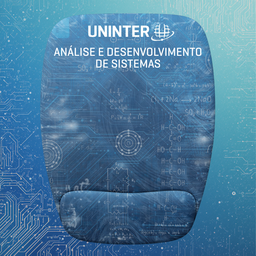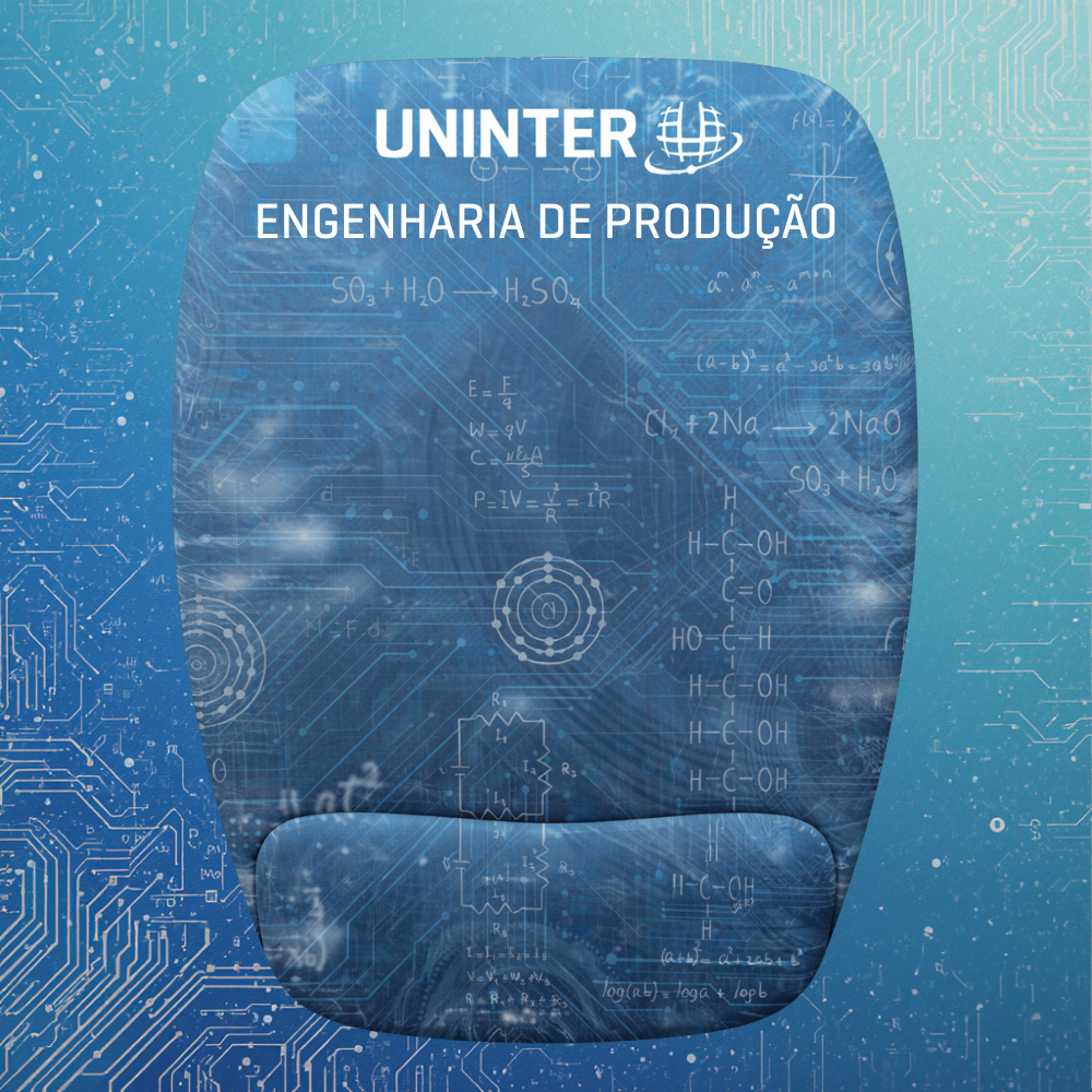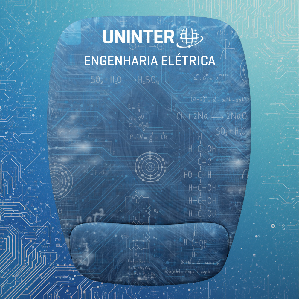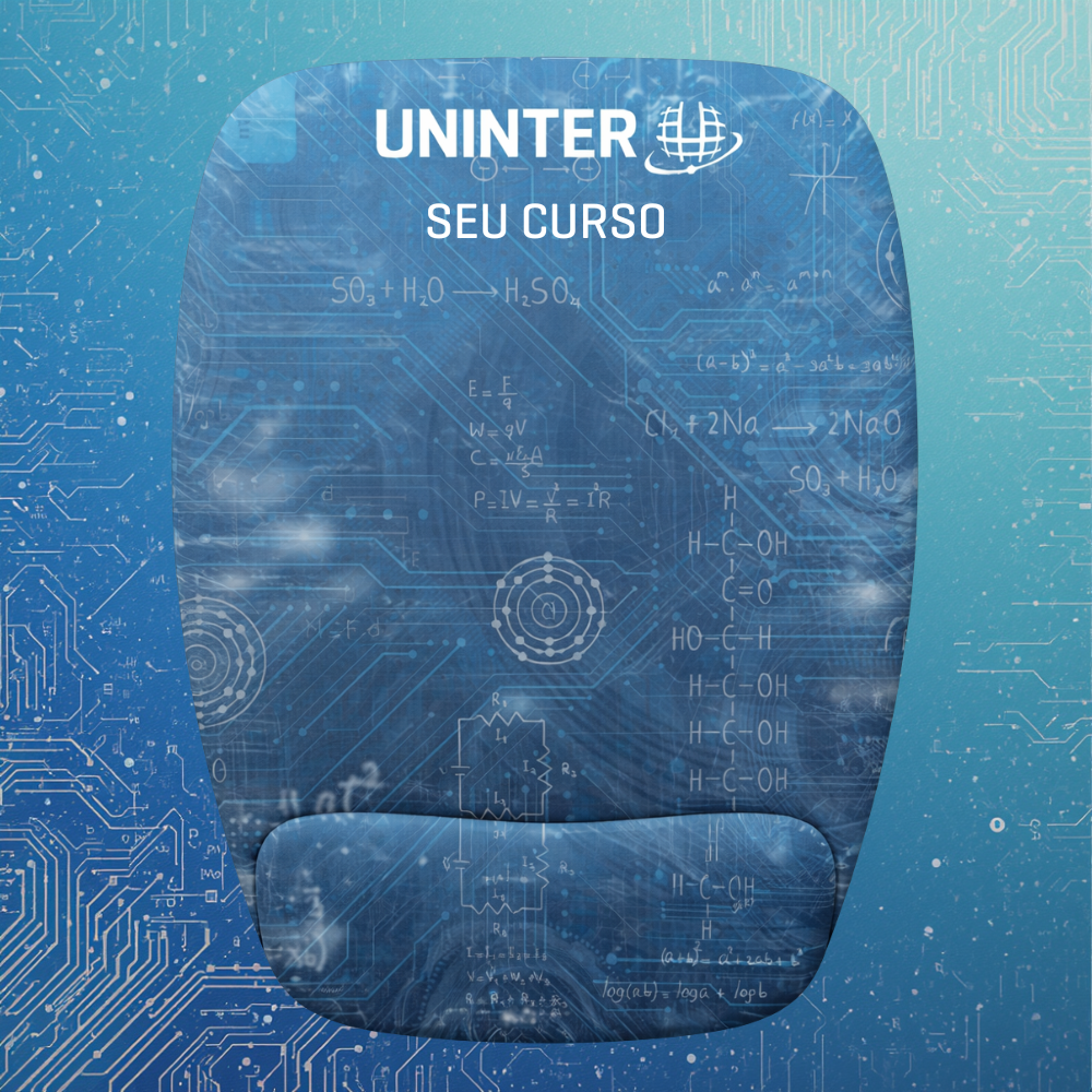 Na parte superior, o mouse pad incorpora a identidade visual da Uninter aliada a elementos gráficos inspirados na Escola Politécnica, com símbolos e referências visuais aos cursos da área. O modelo conta com apoio de punho integrado, que auxilia na redução do esforço e no aumento do conforto durante longos períodos de uso.