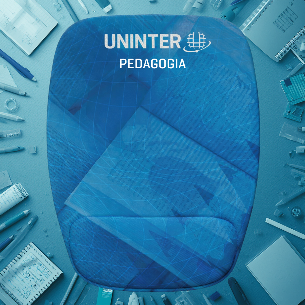 Na parte superior, o mouse pad incorpora a identidade visual da Uninter aliada a elementos gráficos inspirados na Escola de Educação, com símbolos e referências visuais aos cursos da área. O modelo conta com apoio de punho integrado, que auxilia na redução do esforço e no aumento do conforto durante longos períodos de uso.
